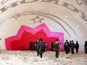 ◆3~4方向にアンカー用車両を配置し、熱気球をロープで係留し、お客様に搭乗していただきます。高度はその日の気象条件や会場の広さによって異なりますが、10m~25mまで上昇します。